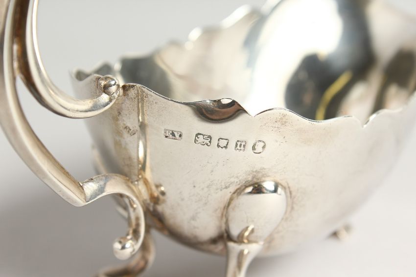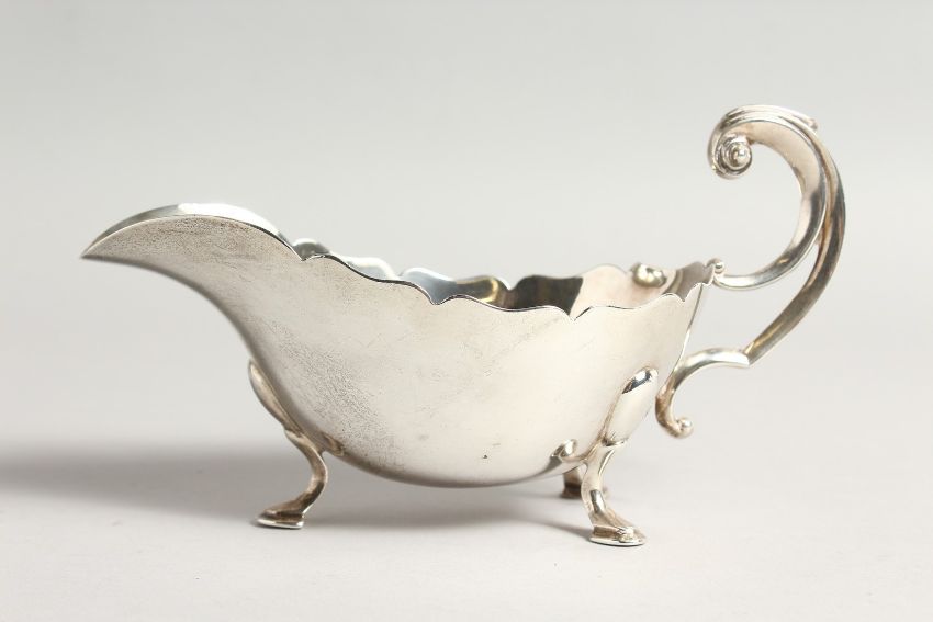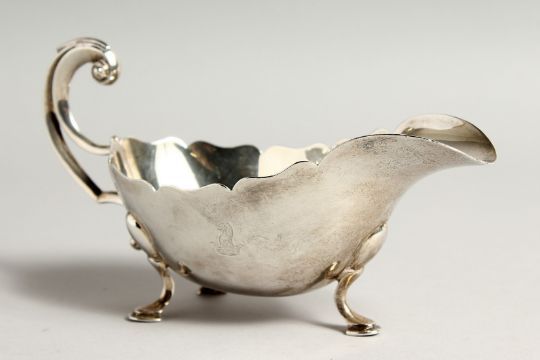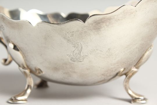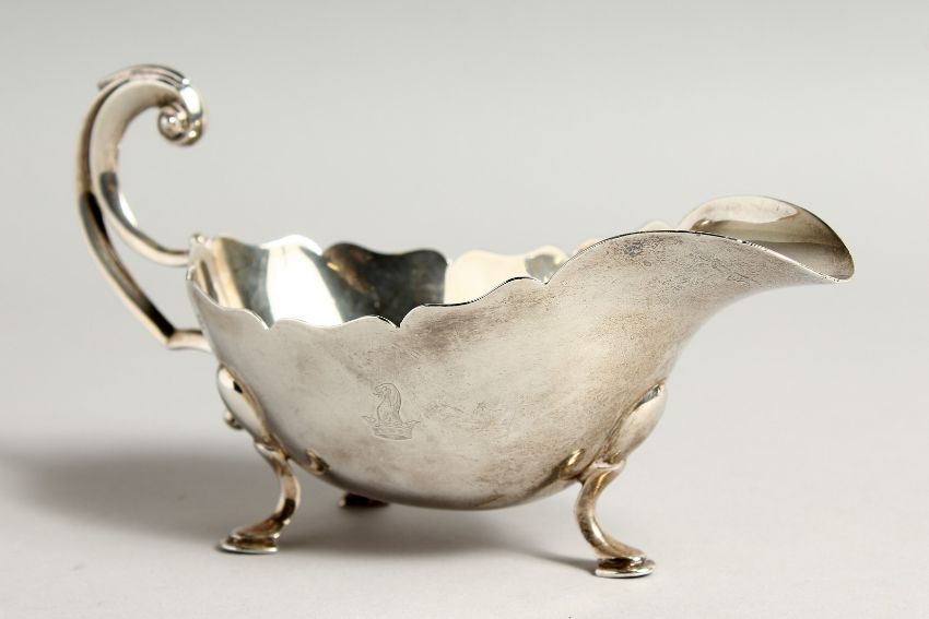A GOOD HEAVY SILVER SAUCE BOAT with crest
