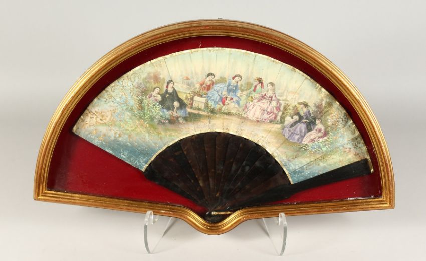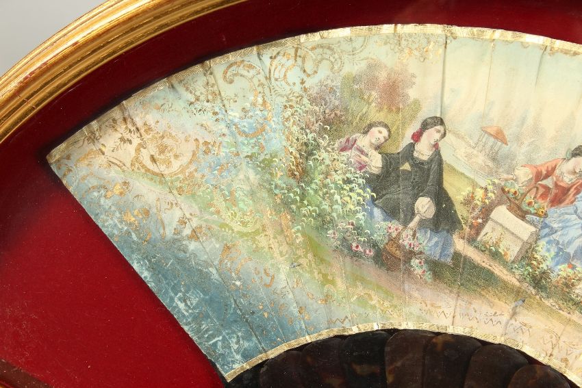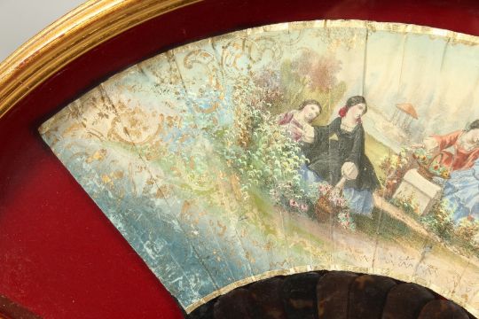 A FRAMED AND GLAZED FRENCH FAN on paper with tortoiseshell