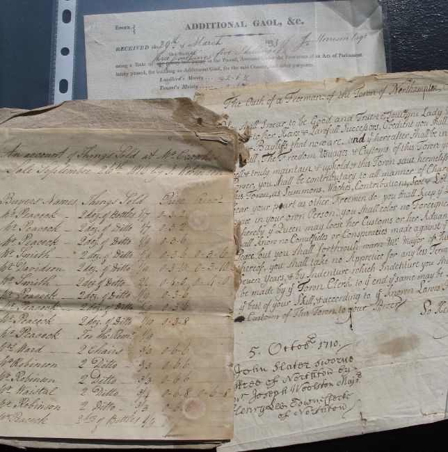 [SOCIAL HISTORY] a ms. "Oath of a Freeman of the Town of Northampton . . . John Slater sworne Free . . . 5 Octobr. 1710," 24 x 19cms; 2 part-printed receipts for the building of Essex County Gaol, 1832/3; AUCTIONEER's "Account of things Sold at Mr. Cranke's Sale Sept. 26th 1816 by J. Robinson," 10 pp. with buyer's names, prices, type of good sold incl. drink & furniture (waterstaining). (4).