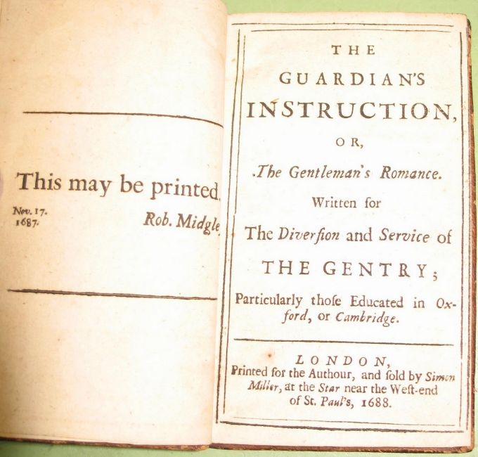 [PENTON (Stephen)] The Guardian's Instruction, or the Gentleman's Romance. Written for . . . those Educated in Oxford or Cambridge, 12mo, license leaf present, title, pp. [12] 90 [2], contemporary calf (upper cover off), L., 1688