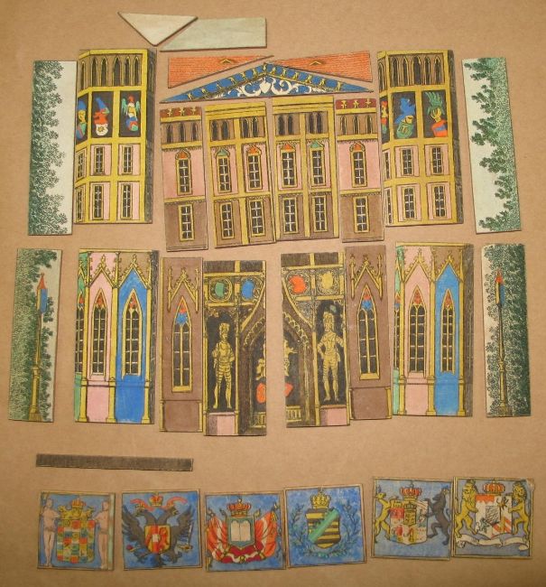 [EARLY 19th c. GAME] "Mappen Schlosser. Castle with the Escutcheons of their owners," [title from lid], original box with sliding lid and pasted down title sheet, 5 further hand-col'd arrangement sheets loose within, together with 28 pieces of re-arrangeable cut & wood-backed image (lacking approx. 8 pieces of small surround & roof), Germany, ca. 1820's, sold not subject to return.