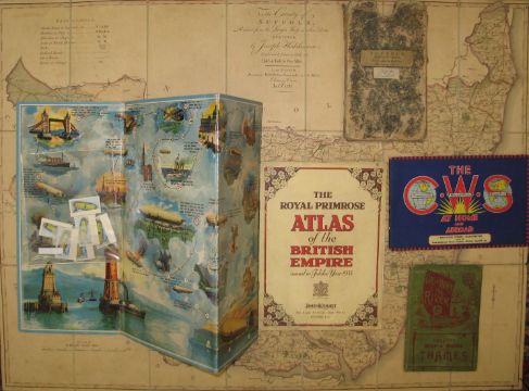 W Faden's folding Map of Suffolk, 1787, slipcase; Bennet's Map & Guide to the Thames; C.W.S. descriptive booklet (140 x 210 mm, 32pp) featuring many pictorial maps; The Royal Primrose Atlas of the British Empire, 1935; [GAME] playing board for airship roll and move game, with reproduction rules and playing pieces (5)