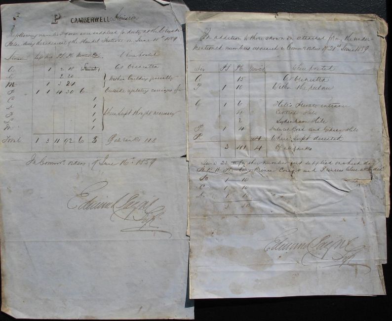 [CRYSTAL PALACE POLICE, 1859] 2 x detailed Police daily attendance sheets / reports for the Crystal Palace, Sydenham, giving numbers of Police Sergeants, P.C.'s and mounted police, filled out in ms., signed by Superintendent Edmund Payne a) 21st June, 1859, "on which day H.R.H. the late Prince Consort and Princess Alice attended." B) stamped "Camberwell Division," detailing the police presence "during the rehearsal of the Handel Festival on June 18th, 1859." Both pieces on blue foolscap paper (one mounted on album sheet), some damage and staining (2).