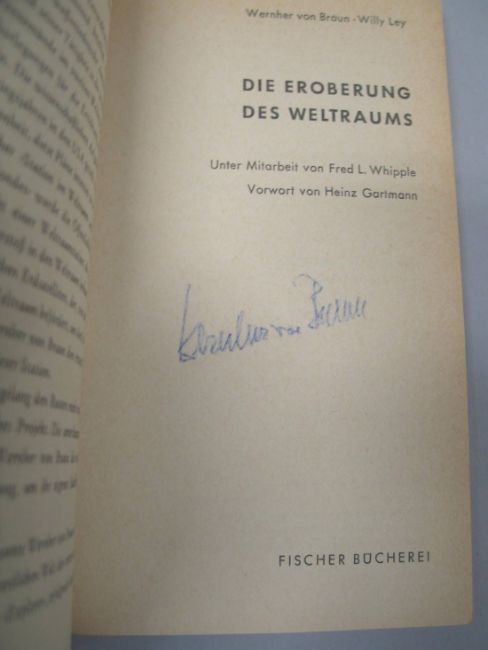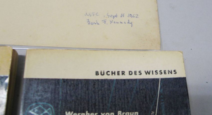 [ROCKET SCIENCE / AMERICAN PRESIDENT KENNEDY SIGNATURE] 2 SIGNED COPIES of the paperback book by rocket scientist WERNHER von BRAUN, "Die Eroberung des Weltraums," 1958; together with a SIGNED (in pencil) piece of paper by AMERICAN PRESIDENT, JOHN F. KENNEDY, dated verso in another hand Sept. 1962, from Kennedy's visit to the Marshall Space Flight Centre. Provenance: by descent from Emil J. Havrilla, who worked at the MSFC as "Small Business Specialist". With a copy of a letter from Wernher von Braun, dated July 26th, 1971, regarding the autographing of the books, and "I enclosed one special present, from 1962, remembering the collective job in MSFC", i.e. the Kennedy signature.