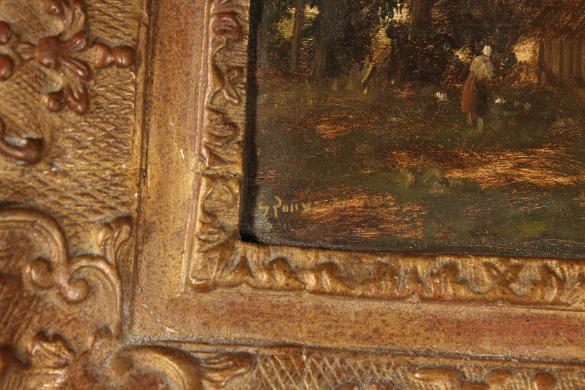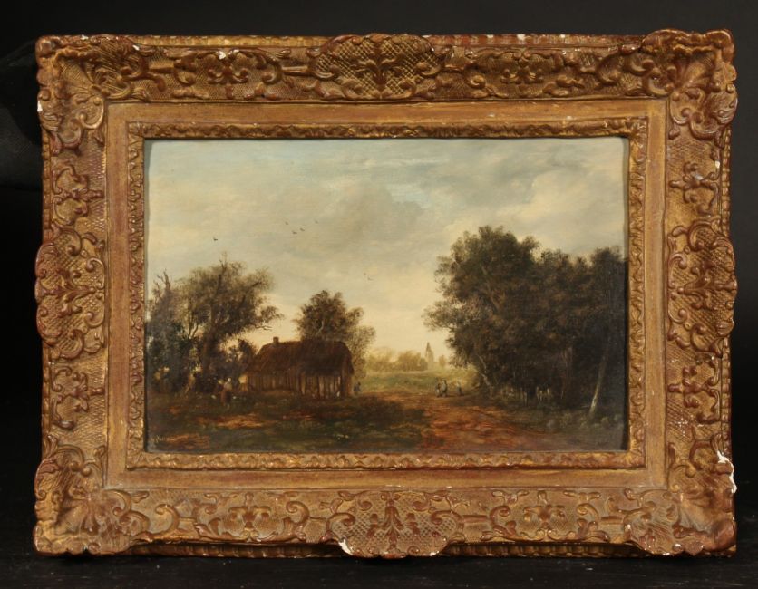 19th Century School, wayfarers gathered on a country path with a church tower beyond, oil on oak panel, indistinctly signed, 8.75 x 13.25.
