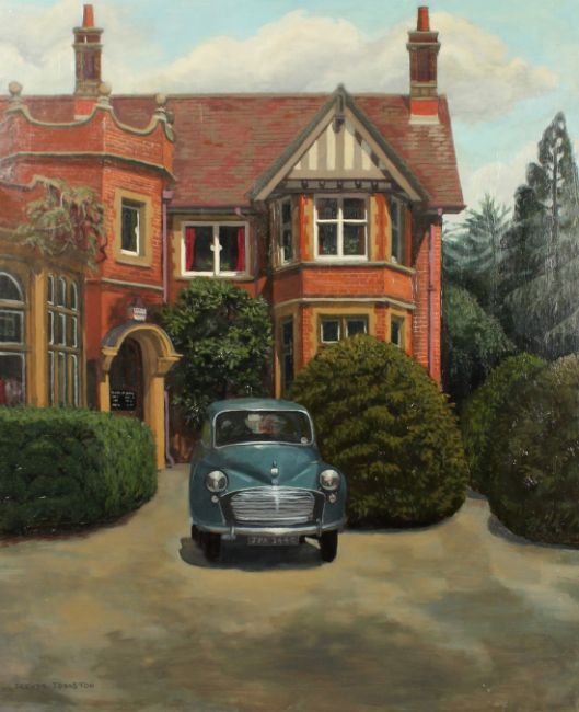 Brenda Johnston (b. 1930) British, A Morris minor parked outside of a red brick building, oil on canvas, signed and inscribed verso, artist s paintings featured in the permanent collection of the National Trust. 23.5 x 19 .