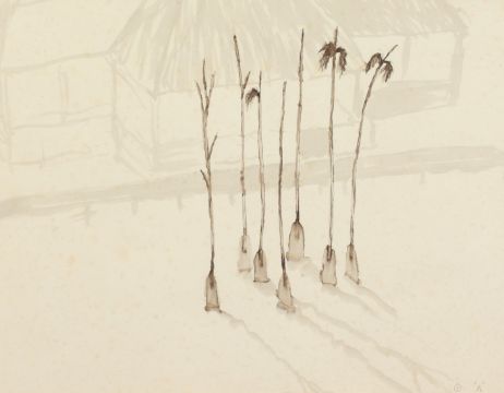 Kcho, Alexis Leiva Machado (b. 1970) Cuban, A view of palm trees with a beach hut beyond, ink and watercolour on arches paper, inscribed A , 19 x 24.5 , Provenance: Arte Real Havana.