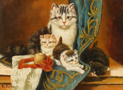 R. Horton, a cat with her kittens on a tabletop, oil on panel, signed, 12 x 16 .
