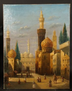 Karl Kaufmann (1843-1905) Austrian, A near pair of oil on canvas scenes of an Eastern city with temples and figures, signed H. Carnier, one 34.25 x 28.5 the other 35.5 x 27.75 .