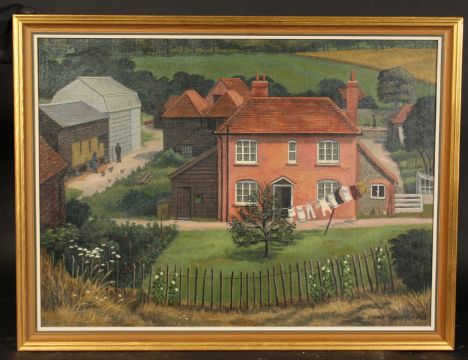 Brenda Johnston (b. 1930) British, A farm building with washing drying on the line, oil on canvas, signed and dated 1975 , artist s paintings featured in the permanent collection of the National Trust. 21.5 x 29.5 .