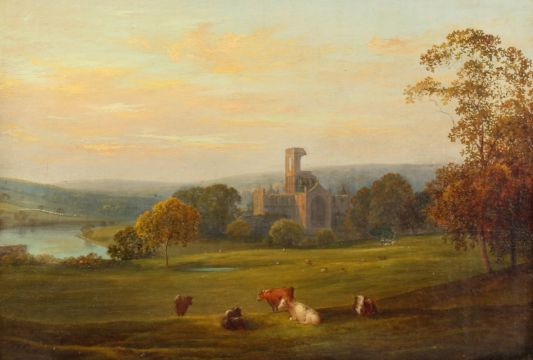 Attributed to Thomas Baker of Leamington (1809-1869) British, A landscape with cows resting in a field with ruins beyond, oil on canvas, 8.5" x 12.5".