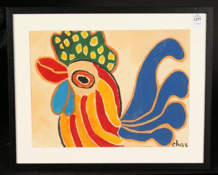 Attributed to Malcolm de Chazal (1902-1981), a study of a cockerel, gouache on arches paper, signed, 10.75 x 14 .