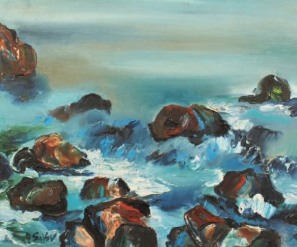 Sava Savov (20th century) A rocky coastal scene, oil on canvas, signed 21.25 x 22.5 .