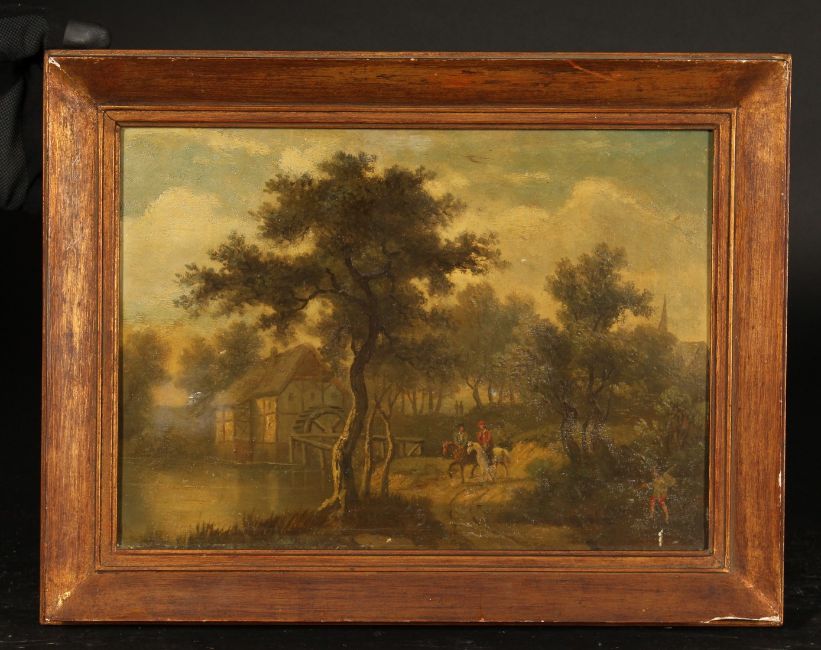 19th century school, possibly Dutch, a scene of figures on horseback by a watermill, oil on mahogany panel, 9.25 x 12.75 .
