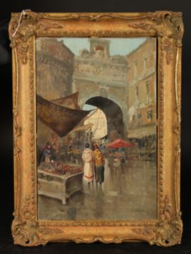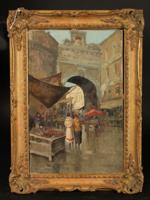 S. Gennaro, Early 20th Century Continental School, Figures in a busy Continental marketplace, oil on canvas, signed, 17 x 11.5 .