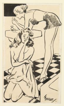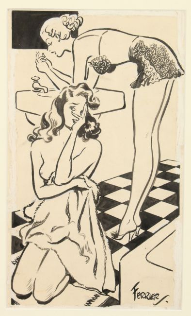 Arthur Ferrier (1891-1973) British, A scene of two woman sharing a bathroom, a spotlight on Sally cartoon, ink and bodycolour, signed, 13.5 x 8 .