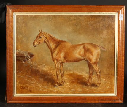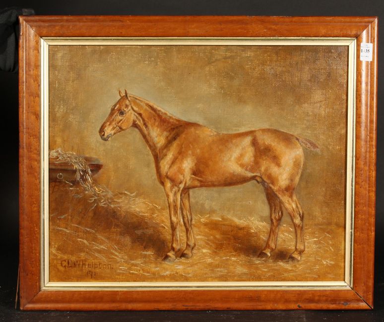 Gertrude Lowe Whelpton (1868-1963) British, A bay hunter in a stable, signed and dated 1911 , 17 x 21 , in a maple frame.