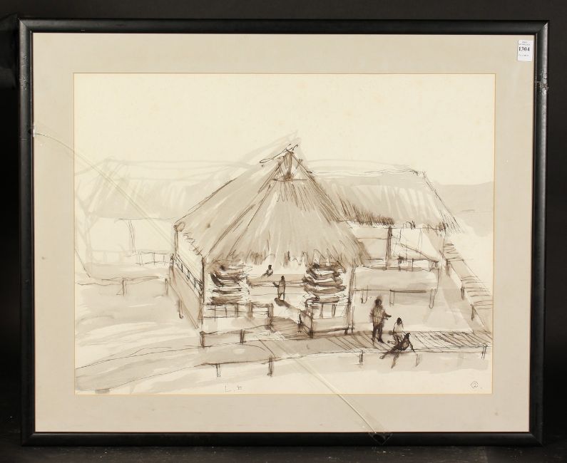 Kcho, Alexis Leiva Machado (b. 1970) Cuban, A scene of figures by a beachside building, ink and watercolour on arches paper, inscribed L.B. , 19 x 24.5 , Provenance: Arte Real Havana.
