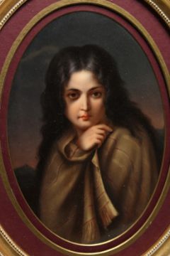 19th century German school, A young girl with long hair, painted porcelain oval plaque, 11.5 x 7.5", in a wood gilt frame.