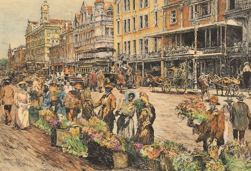 20th century South African School, Figures at a flower market (possibly Cape Town), coloured etching, 5.5 x 7.75 .