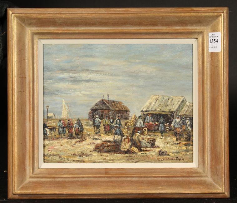 Figures on a beach attending a market, oil on panel, signed Dupres , 8 x 10 .