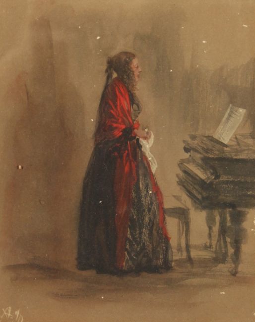 After Adolph Von Menzel, A lady by a piano, chromolithograph, 7 x 5.5 , (a/f).