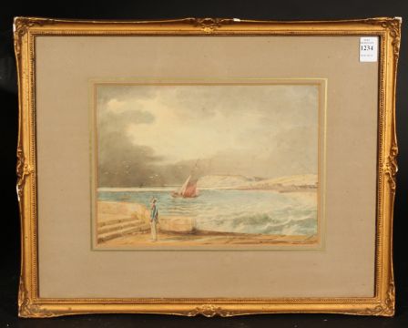 19th century French school, a coastal scene with a soldier walking along the promenade with boat and figures beyond, watercolour, 8" x 11".