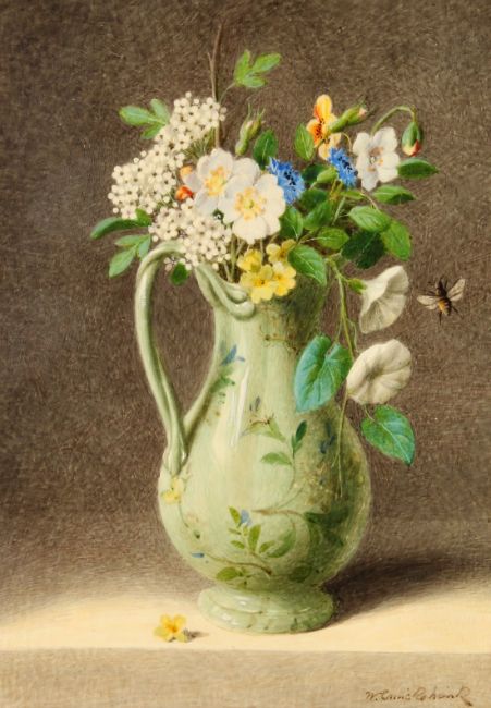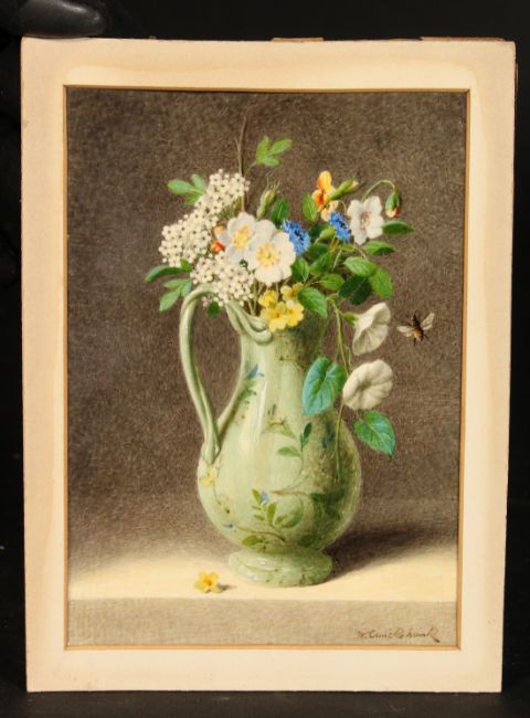 William Cruickshank (1848-1922) British, A pair of still life paintings of mixed flowers, watercolour on ivory, signed, each 7 x 4 , (ivory bowed), (2).