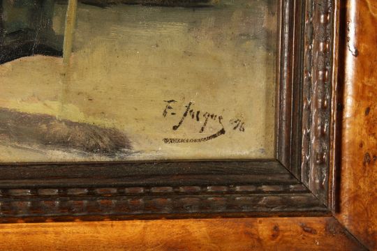 Frederique Jacque (1859-1931) French, A lady brushing the floor of a lavish interior, oil on mahogany panel, signed and dated 1896, 13 x 9.25 .