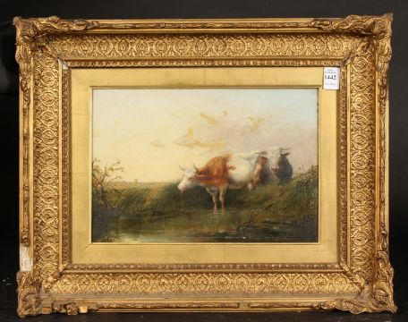 Attributed too Thomas Baker of Leamington (1809-1869) British, Two bulls watering on a riverbank, oil on canvas, 8.5" x 12.5".