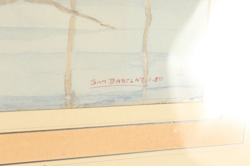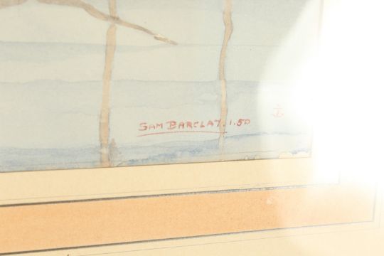 Sam Barclay (20th Century), a study of moored sailboats, watercolour, signed and dated 50, 14 x19 .