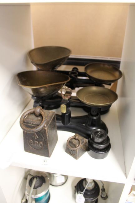 Two kitchen scales with weights.