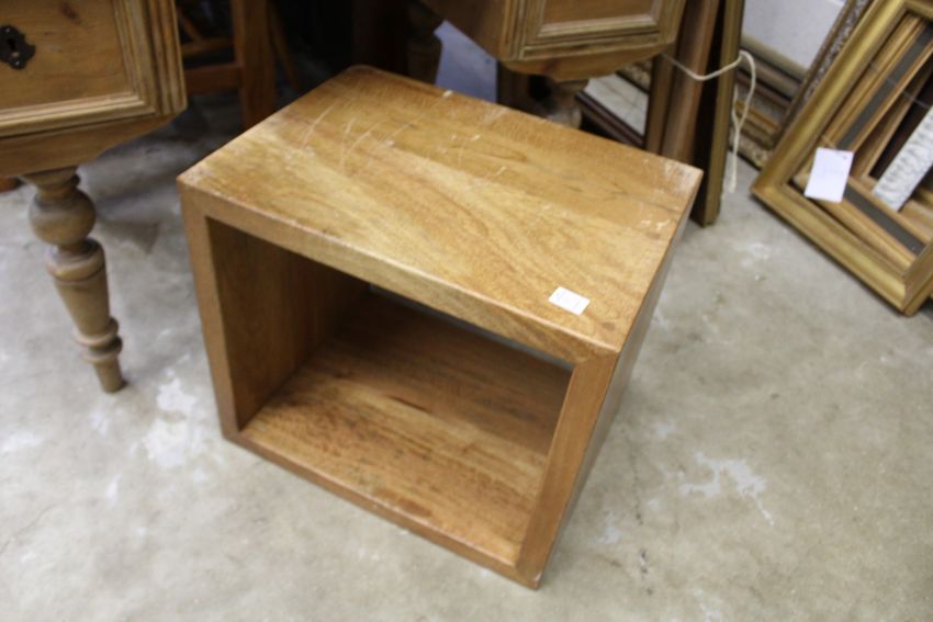 A bureau and a cube shaped table.