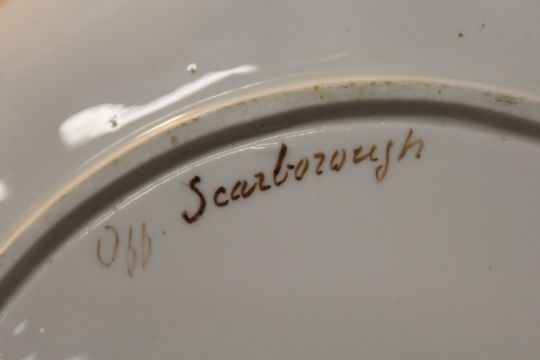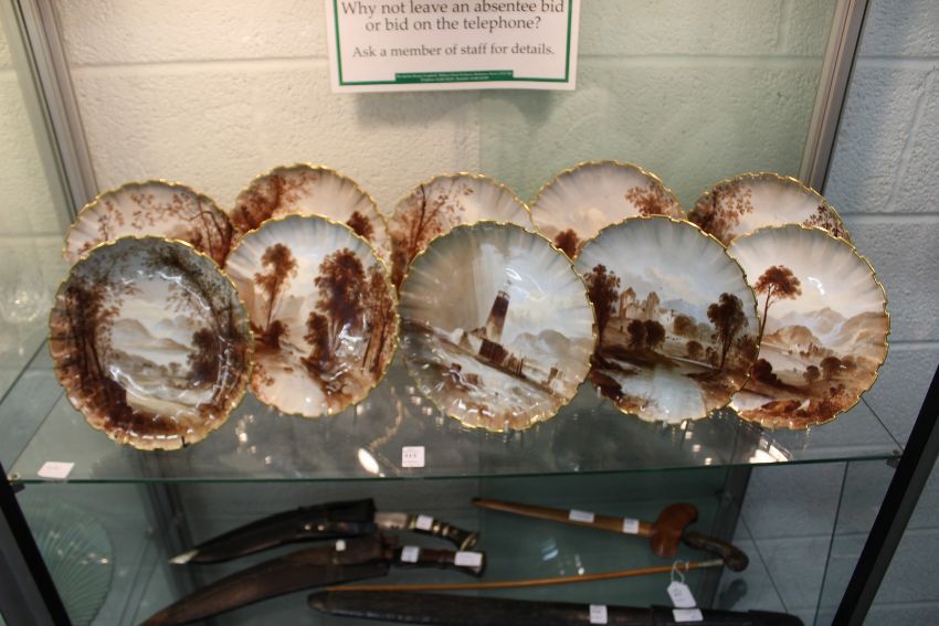 A set of ten Spode cabinet plates painted in a sepia style with various Scottish and other landscape scenes (one AF).