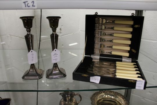 A pair of silver candlesticks and a cased set of plated fish knives and forks.