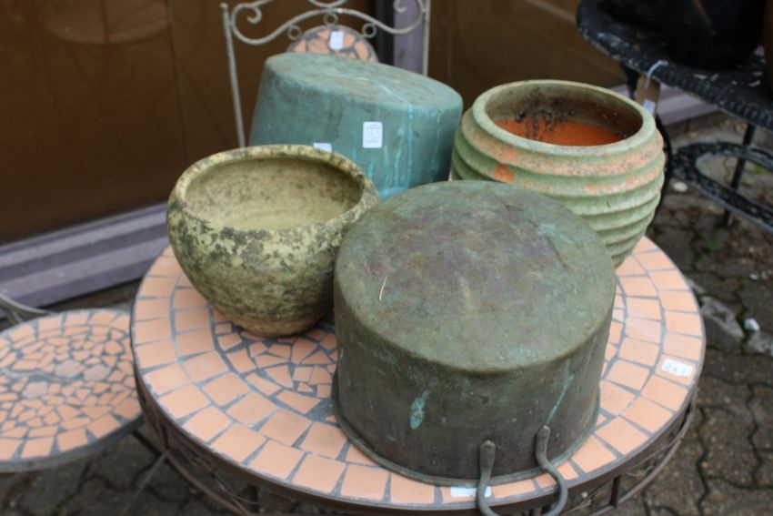 Terracotta and stoneware pots and two old copper saucepans.
