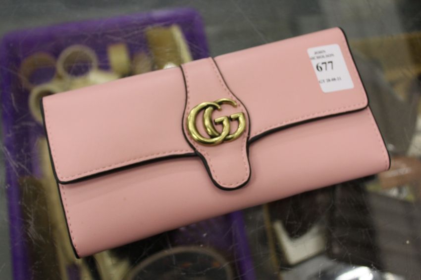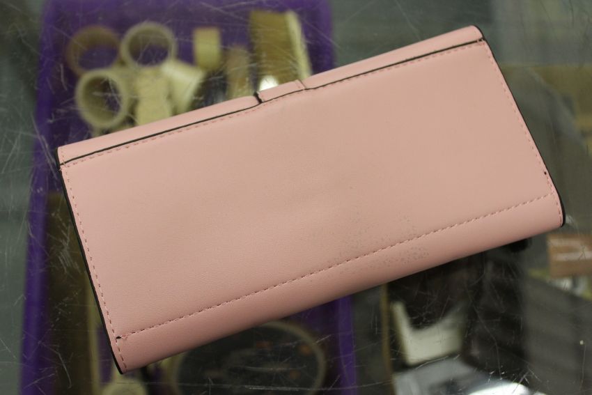 A pale pink leather ladies' purse.