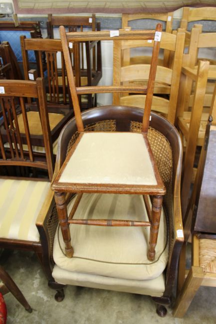 A Bergere style armchair a small chair and a folding mirror.