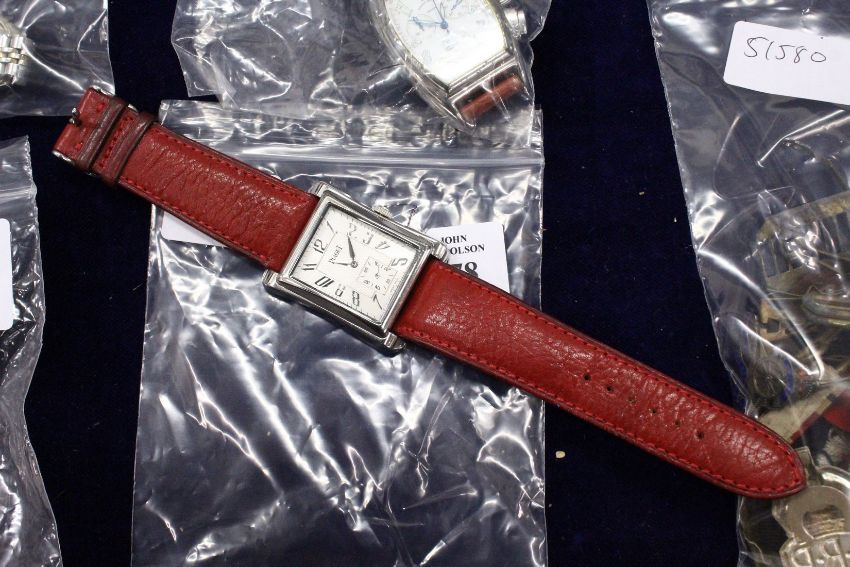 A stainless wristwatch with leather strap.
