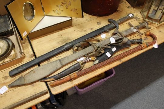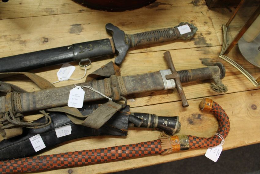 An eastern dagger, a Gurkha kukri, a Chinese sword, another sword and a walking stick.