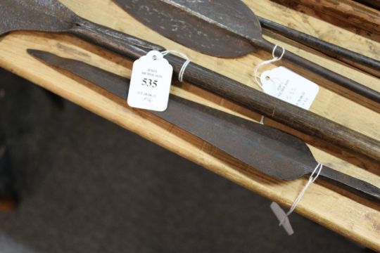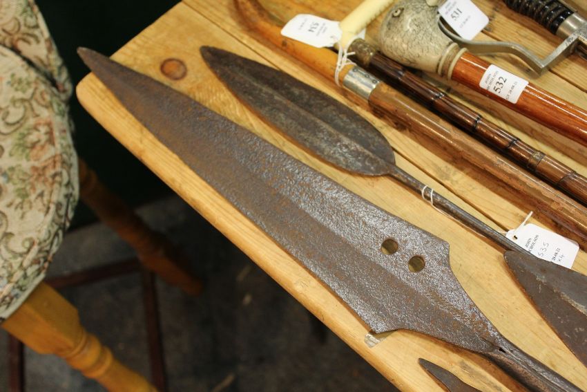 A large steel headed spear together with two Assegai spears and another spear head.