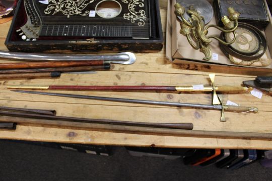 Toye & Co Ltd. London, a Masonic sword, lacking scabbard, together with another Masonic sword with etched blade and scabbard.
