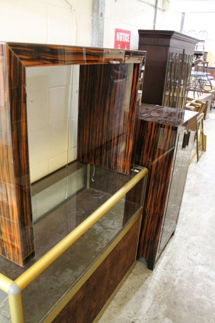 An unusual glass console table and a pair of matching cabinets.