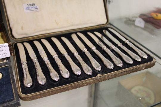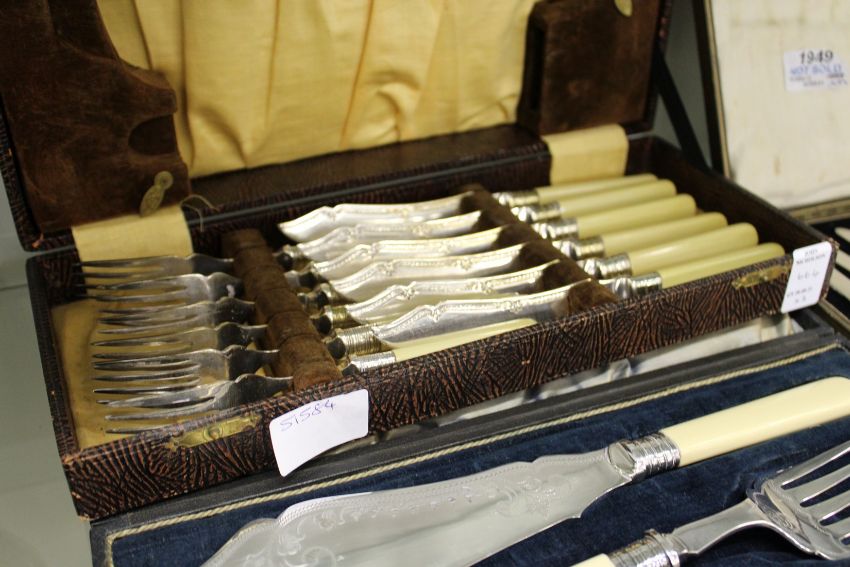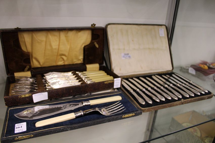 A cased set of silver handled fruit knives, a cased set of fish servers and a cased set of fish knives and forks.
