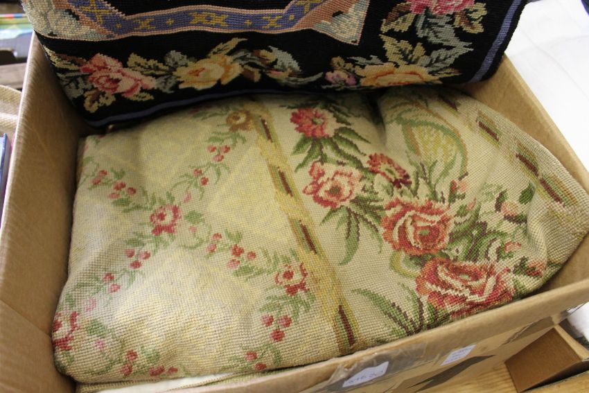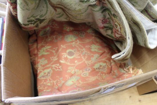 Two Aubusson style tapestry wall hangings and an embroidered throw or bed cover.