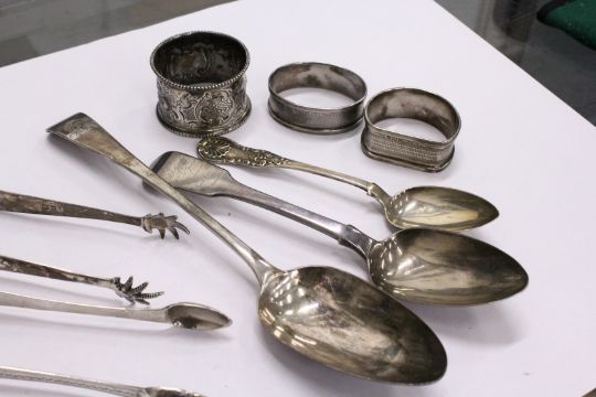 Silver ware, to include spoons, sugar tongs, napkin rings.
