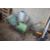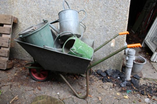 A wheelbarrow and a quantity of galvanized watering cans and buckets.