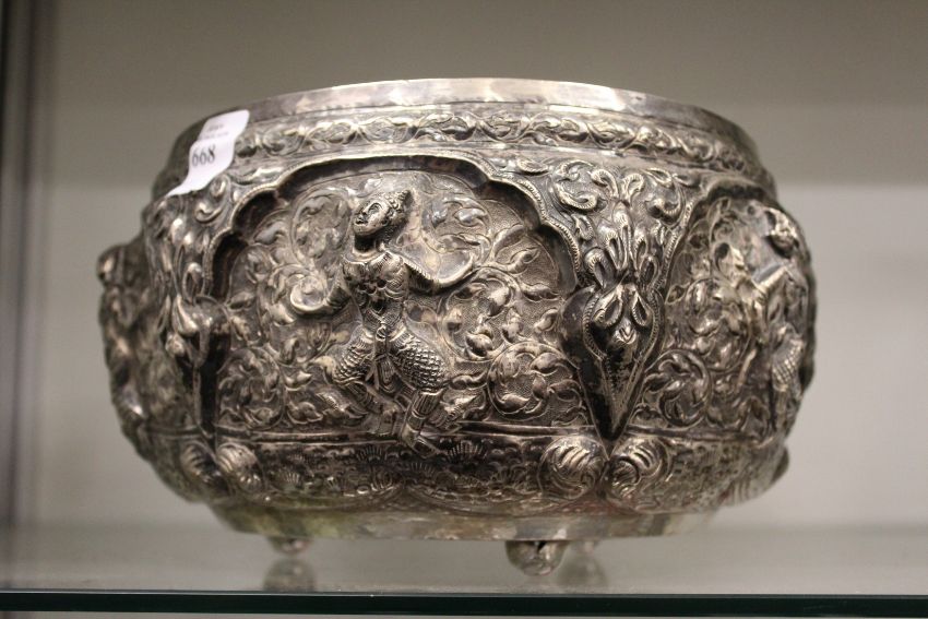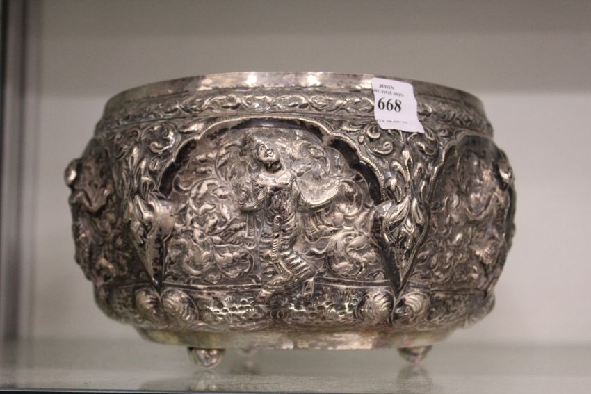 A good Indian white metal repousse bowl, tests as silver, decorated with panels of dancing figures on three ball feet, 8ins diameter x 5.5ins high. 23ozs.