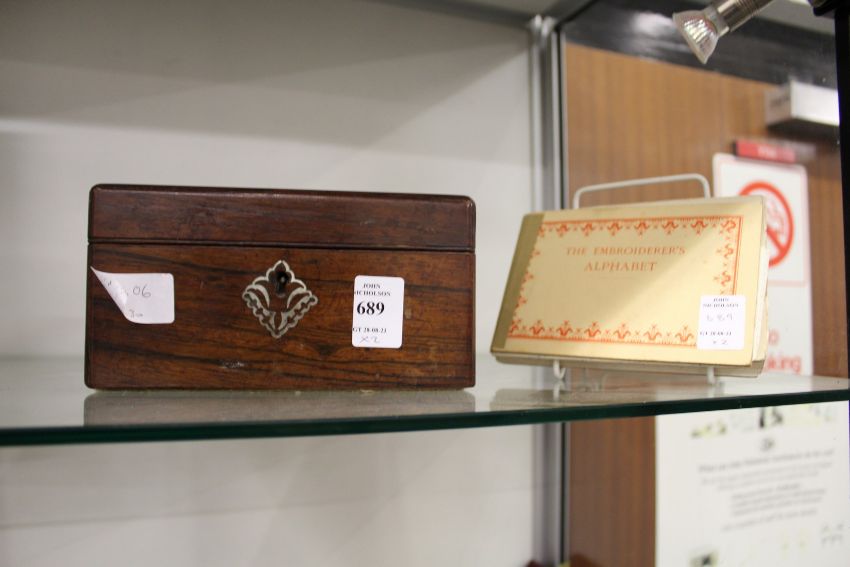 A small Victorian rosewood sewing box and an alphabet book.