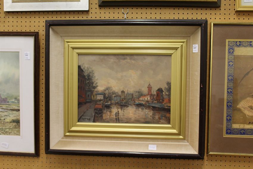 A continental river landscape with buildings oil on board, signed.